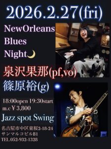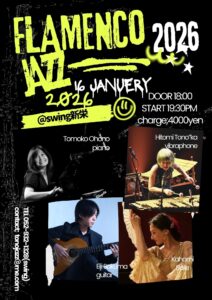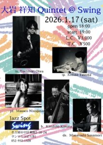 南山大学ジャズ研究部 N.A.Q 毛利英暉(Vo) 綾野佑奈(Acc) 下村未菜実(AS) 時田亘(P) 伊原寛司(P) 奥村慎太郎(B) 沖本英太郎(Dr) 19時スタート 一般2,000円 (テーブルチャージ500円 […]