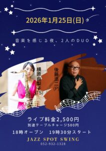 竹中優子(AS) 館岡紅介(P/ Tp) 高間康弘(B) 参加演奏2,000円 見学1,500円 学生1,000円
